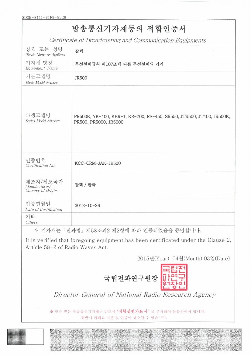 목록 [기타] 제품 인증서(JR-500 SERIES) 작성자 잘텍 작성일 17-05-15 10:16 | 조회 58,431 | 댓글 0 본문 JR-500SERIES 이전글다음글 댓글목록 0 등록된 댓글이 없습니다. 목록